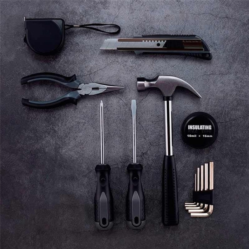 جعبه ابزار jiuxun  برند زیر مجموعه شیائومی با ابعاد 73*203*276 میلی متر و وزن 1369 گرم از 12 ابزار مختلف بهره می برد که درون یک جعبه پلاستیکی با کیفیت قرار داده شده اند که شامل یک پیچ گوشتی دو سو، یک پیچ گوشتی چهار سو ، چکش با یک سری میخ کش ، کاتر، دم باریک و یک متر (3 متری) و پنج عدد آچار آلن می باشد؛ که کابران می توانند با تهیه این پک ابزار تقریبا خیلی از نیاز های خود را پوشش دهند.البته اشاره به این نکته نیز حائز اهمیت است که در قسمت درب کیف این محصول یک مکان جهت قرار گیری پسب برق می باشد که البته لازم به ذکر است که خود این کالا دارای یک عدد چسب برق نیز می باشد.