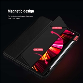 کیف چرمی bevel نیلکین ساخته شده از مواد pcو tpu هست ,و روکش قاب از جنس چرمی هست که مقاوم و ضد لغزش هست،کیف دارای اتصال آهنربایی و همچنین خاصیت anti-slepp هست که با باز شدن در کیف تبلت صفحه ipad شما روشن میشود و همچنین با بسته شدن آن صفحه تبلت خاموش میشود.