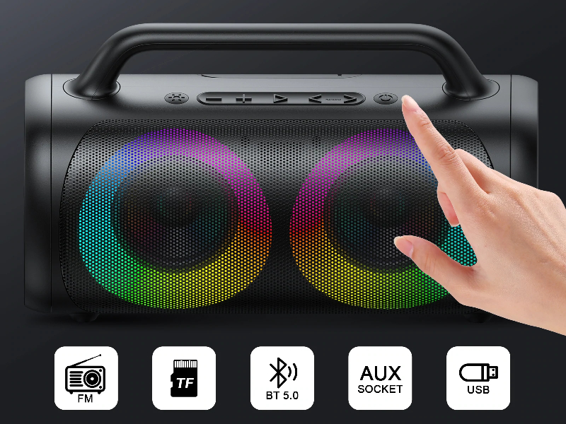 داشتن 9 حالت نورپردازی RGB جلوه زیبایی به اسپیکر بخشیده است. با کلیدی که روی پنل کنترل قرار دارد می توانید آن را تنظیم کنید. نورپردازی با ریتم موسیقی هماهنگ می شود.
