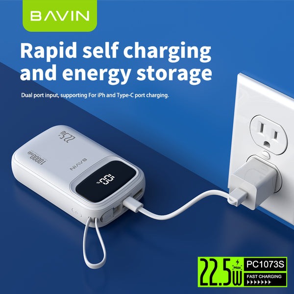 پاوربانک Bavin PC1073s یک شارژر همراه جمعوجور و قدرتمند است که با ظرفیت 10000 میلیآمپر ساعت و توان خروجی 22.5 وات طراحی شده تا دستگاههای شما را با سرعت بالا و ایمن شارژ کند. این پاوربانک گزینهای عالی برای کسانی است که به دنبال قدرت، سبک بودن و حمل آسان هستند.