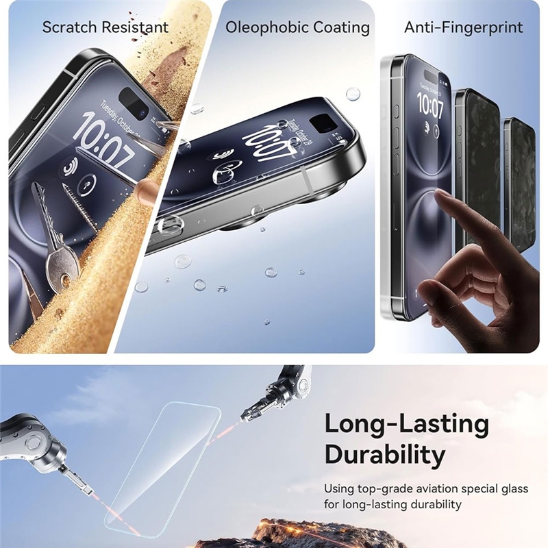 سطح شفاف و کریستالی این گلس باعث میشود کیفیت تصاویر و رنگها با وضوح اصلی نمایشگر آیفون 17 Air نمایش داده شود. همچنین پوشش اولئوفوبیک تعبیهشده روی آن، از ایجاد لکههای چربی و اثر انگشت جلوگیری کرده و تجربهای روان و تمیز هنگام لمس صفحه را فراهم میآورد.