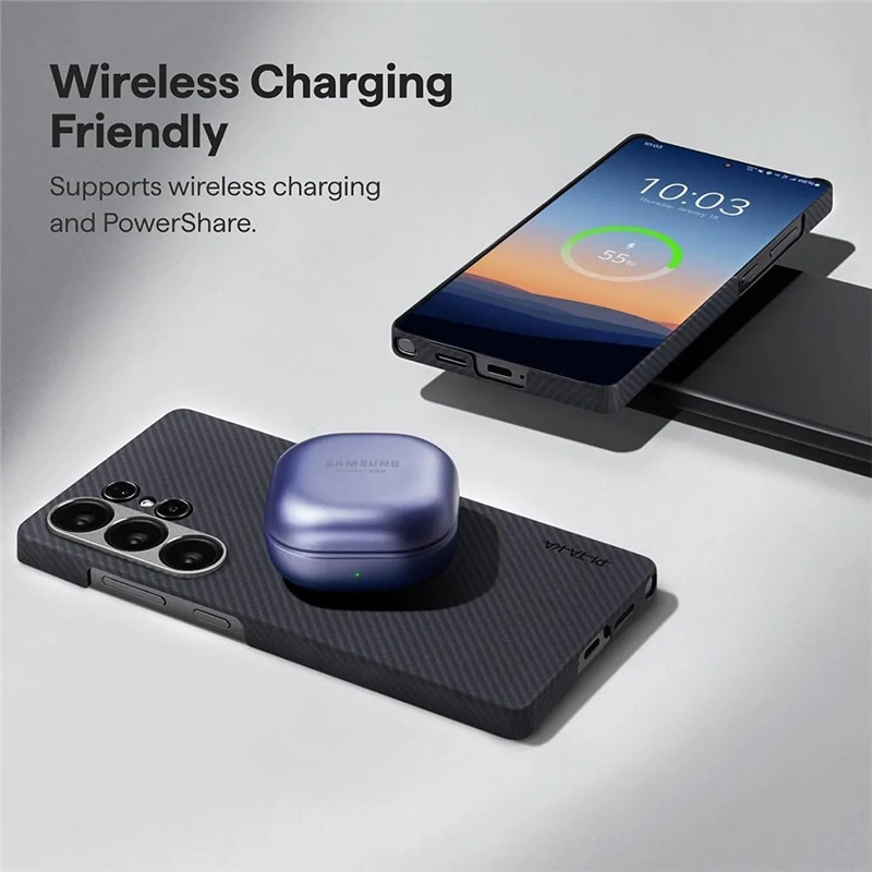 قاب گلکسی S25 Ultra مدل PITAKA Ultra-Slim Case 600D کاملاً با شارژ بیسیم سازگار است و نیازی به جدا کردن قاب برای شارژ نیست. این ویژگی استفاده روزمره را ساده و راحت میکند.