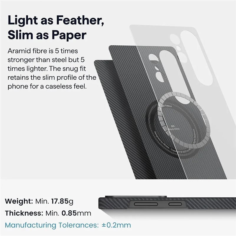 با ضخامت حدود ۰.۹۵ میلیمتر و وزن تنها ۲۳.۸۹ گرم، قاب گلکسی S25 Ultra مدل PITAKA Ultra-Slim Case 600D یک محافظ تقریباً نامرئی است که برای طرفداران طراحی مینیمال و سبک، انتخاب ایدهآل محسوب میشود. لمس بافت لطیف آرمید، حس لوکس و دلپذیری به کاربر منتقل میکند و تجربه نگه داشتن گوشی را لذتبخش میکند.