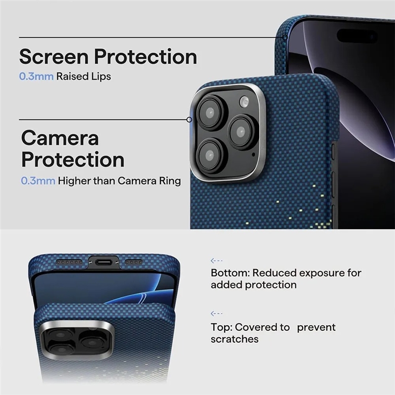 الیاف آرمید به کار رفته در قاب آیفون ۱۶ پرو مکس PITAKA Moonrise Tactile Woven، مقاومت فوقالعادهای در برابر خراش و خوردگی فراهم میکند، بدون اینکه وزن گوشی افزایش یابد. این ماده در صنایع هوافضا و نظامی هم استفاده میشود، بنابراین میتوانید مطمئن باشید که آیفون شما در دستان شما کاملاً محافظت شده است.