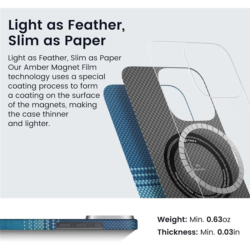 دیگر نیازی به خارج کردن قاب برای شارژ بیسیم یا استفاده از لوازم جانبی MagSafe نیست. قاب آیفون ۱۶ پرو مکس PITAKA Moonrise Tactile Woven به لطف فناوری SlimBoard سرعت شارژ بیسیم را کاهش نمیدهد و تمامی لوازم جانبی MagSafe را پشتیبانی میکند.