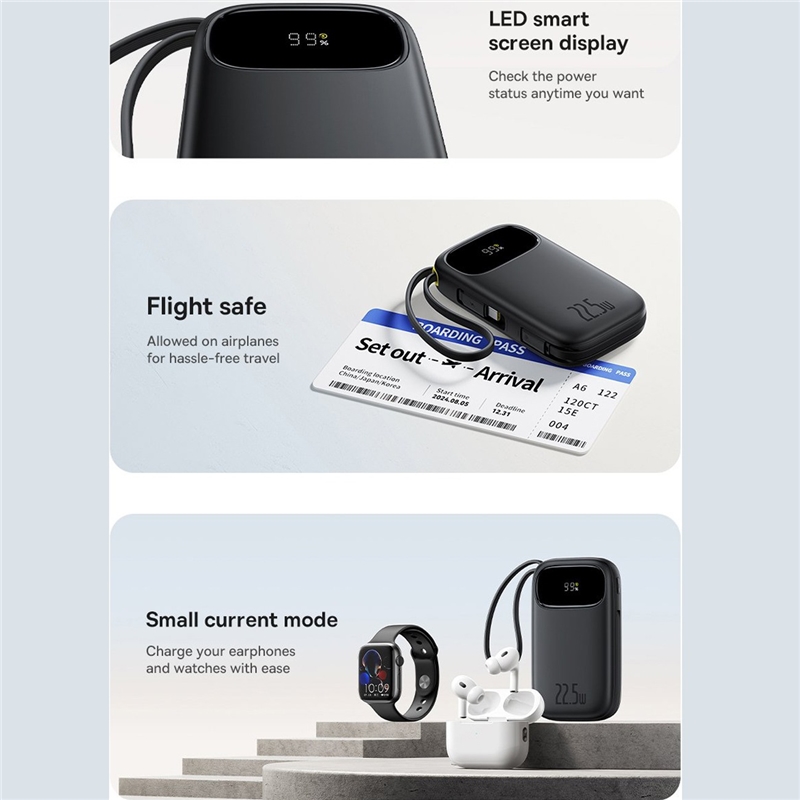 این مدل با دو کابل Type-C و Lightning متصل به بدنه، به شما اجازه میدهد دستگاههای مختلف را بدون نیاز به حمل کابل جداگانه شارژ کنید. طراحی هوشمند، نمایشگر دیجیتال و پشتیبانی از شارژ سریع، آن را به گزینهای ایدهآل برای استفاده روزمره و سفر تبدیل کرده است.