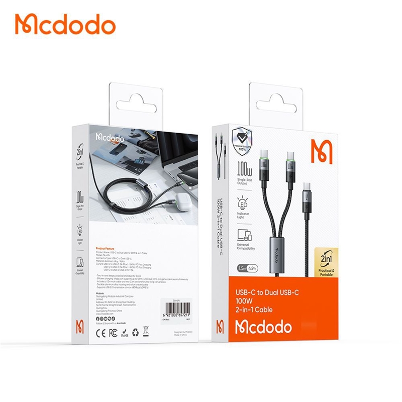 ⚡ کابل شارژ چند سر تایپ‌سی مک‌دودو مدل Mcdodo 2in1 Cable CA-6740 طول ۱.۵ متر توان 100 وات
