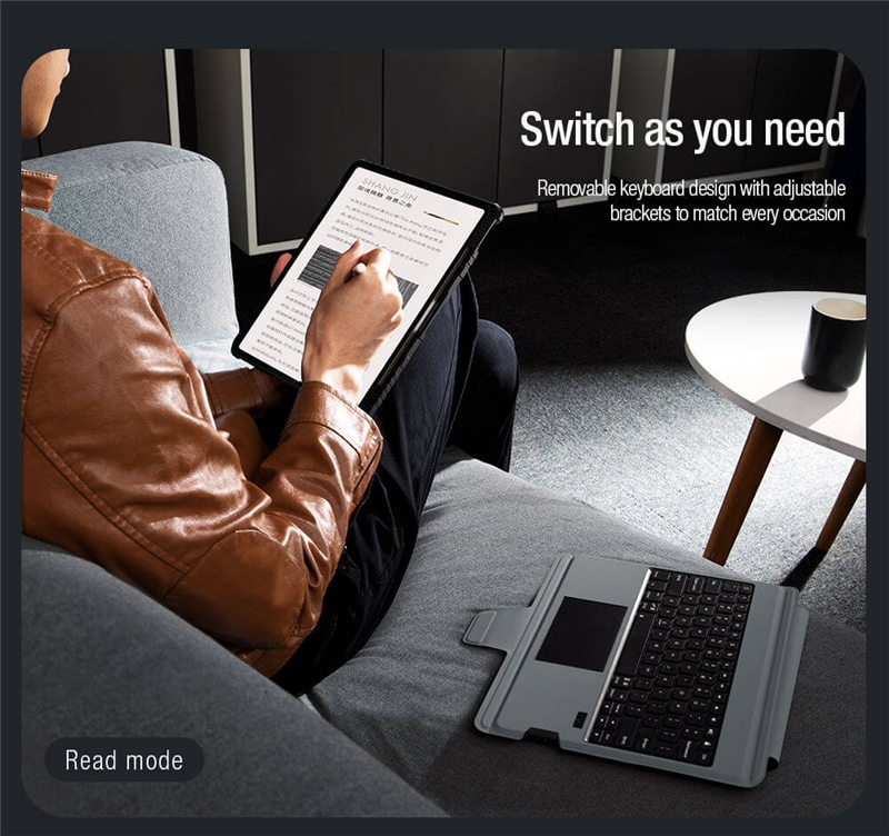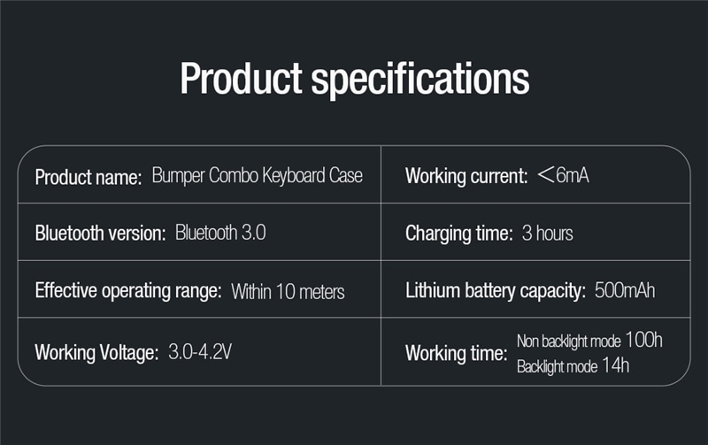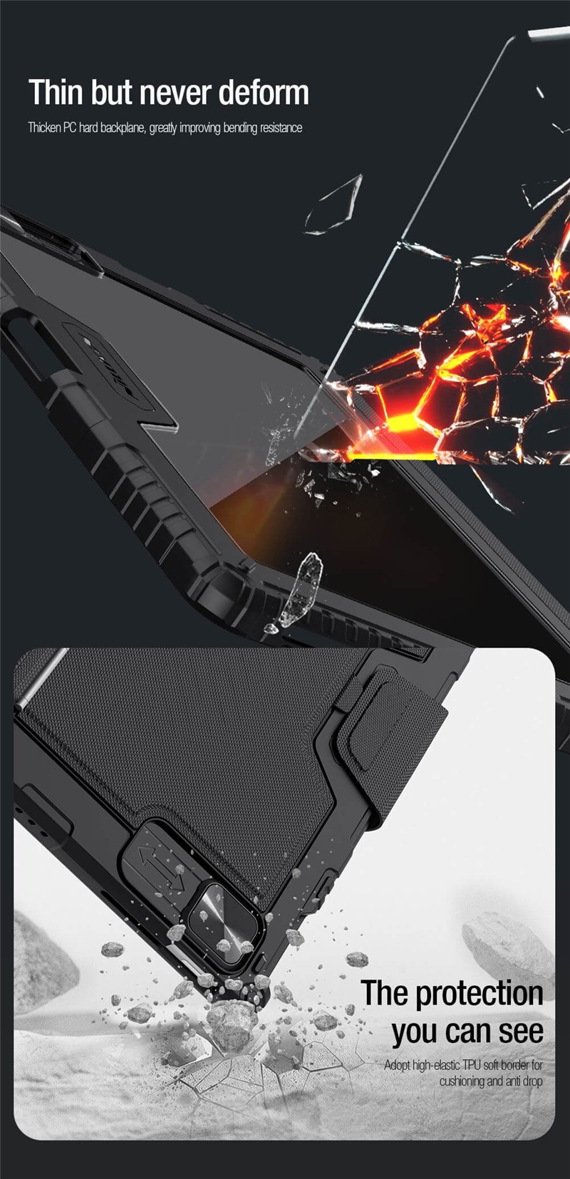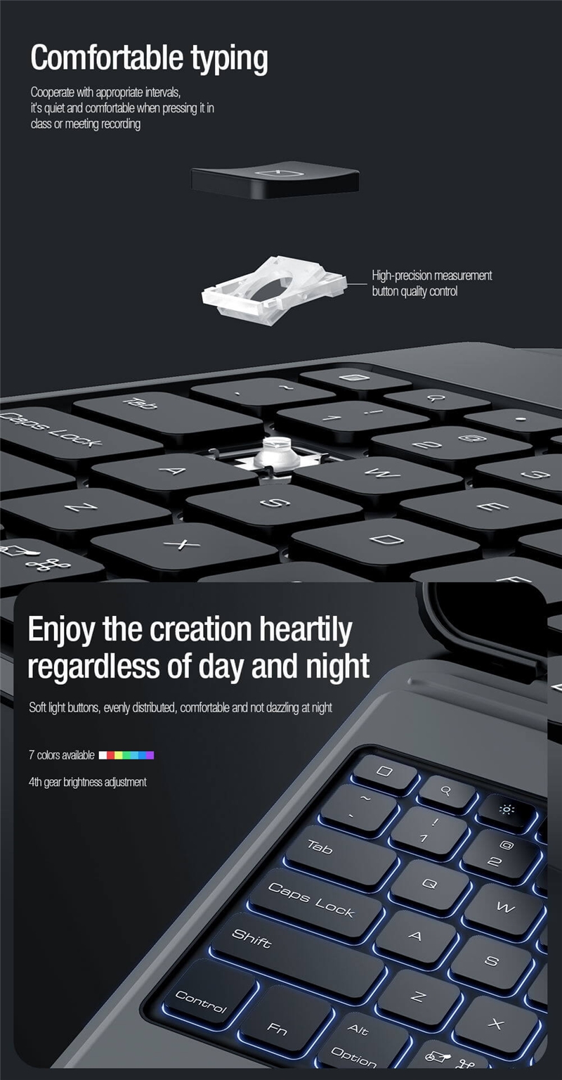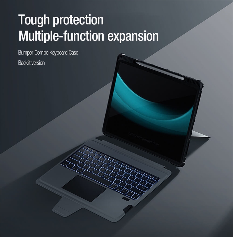 کیف کلاسوری نیلکین مدل Bumper Combo Backlit Keyboard جدیدترین نسخه Combo Keyboard می باشد که در مدل Backlit علاوه بر ویژگی های نسخه قبلی ویژگی نور پس زمینه در کیبورد با 7 رنگ متفاوت به آن اضافه شده که دیگر در فضای کم نور و یا شب به راحتی میتوانید از کیبورد استفاده کنید و دیگر دغدغه نور هنگام تایپ کردن را نداشته باشید.جنس این کاور ازTPUوPCساخته شده که دارای مقاومت بالایی می باشد.این کیف کلاسوری دارای محافظ دوربین بوده که به صورت کشویی عمل میکند.یکی از قابلیت های مفید در قاب تبلت ها داشتن استند است؛چون این دستگاه ها ابعاد بزرگی دارند و نگهداری از آنها روی استند بسیار راحت تر و کم خطر تر است.از همین رو کیف کلاسوری دارای یک استند تاشو است که استحکام کافی برای نگهداشتن و استفاده از تبلت را خواهد داشت.شما می توانید حالت های مختلفی برای قرار گرفتن تبلت انتخاب کنید.این استند قابلیت تنظیم زاویه بین 110تا180درجه را دارد.این محصول نیلکین دارای یک کیبورد قابل جدا شدن می باش .شما در صورت نیاز می توانید از این کیبورد استفاده کرده و یا آن را جدا کنید.کلیدهای این کیبورد به گونهای(قطرهای)طراحی شده که قالب انگشتان شما باشد.این کلیدها بسیار بی صدا بوده و وزن پایینی دارد؛بعلاوه کار با آن شما را خسته نمیکند.کلیدهای کیبورد کیف کلاسوری بسیار حساس بوده و با کمترین فشار عمل خواهد کرد.بر روی این کیبورد یک پد لمسی وجود دارد که می توانید از آن به جای موس استفاده کنید.شما می توانید از طریق بلوتوث این کیبورد را به دستگاه خود متصل کنید.نرخ نمونه برداری لمسی پد لمسی آن120هرتز بوده که بسیار حساس بوده و از چند لمس همزمان پشتیبانی می کند.این کیبورد دارای یک باتری5000میلی آمپر ساعتی بوده که برای پر شدن آن نیاز به حدود 3 ساعت شارژ بوده و با پر بودن شارژ تا100 ساعت می توانید از آن استفاده کنید؛البته این عدد برای روزی2ساعت کار با کیبورد است که متناسب با استفاده شما متغییر خواهد شد.قابل ذکر است نسخه بلوتوث این کیبورد3.0می باشد و محدوده عملکرد آن حدود10متر است.در قسمت جلویی این قاب، جای برای قرار گرفتن قلم هوشمند اپل تعبیه شده که می توانید قلم خود را در این قسمت ها قرار دهید. با قرار گرفتن قلم در قسمت جلویی تعبیه شده در تبلت، می توانید قلم خود را به صورت وایرلس شارژ کنید.