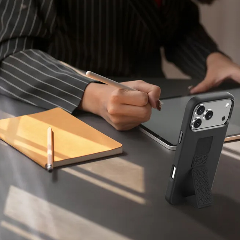 یکی از کاربردی‌ترین بخش‌های این قاب، استند فلزی تاشو است که امکان قرار دادن گوشی در حالت‌های افقی و عمودی را برای تماشای فیلم، تماس تصویری، مطالعه و کار روزمره فراهم می‌سازد. این استند با طراحی محکم، زاویه دید ایده‌آل و استفاده آسان، تجربه کاربری بسیار رضایت‌بخشی ارائه می‌دهد.