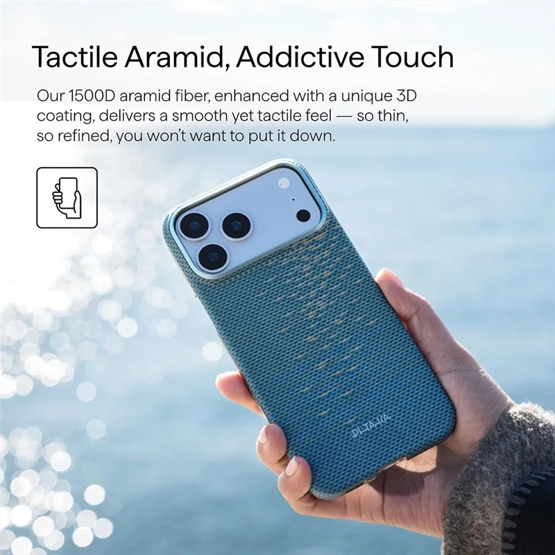 قاب آیفون ۱۷ پرو مکس PITAKA Ultra Slim Lucid Blue یک محصول خاص و پیشرفته از سری LightRipple برند PITAKA است. این سری با هدف به تصویر کشیدن لحظات زودگذر طبیعت از طریق بافتبافی پیشرفته الیاف آرامید طراحی شده است. مدل Lucid Blue با الهام از انعکاس نور طلایی خورشید بر سطح آب زلال خلق شده و تلاشی است برای ثبت این زیبایی زودگذر در قالب یک قاب تلفن همراه.
