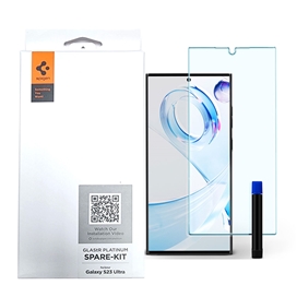 محافظ صفحه نمایش اسپیگن Galaxy S23 Ultra Screen Protector Platinum Tray یک کیت شامل یک گلس شیشه ای با درجه سختی ۹H و یک مایع مخصوص برای پوشش UV این شیشه بصورت ۳D می باشد.