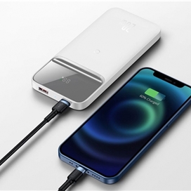 انک وایرلس بیسوس PPCXW10-X- پاوربانک مگنتی وایرلس بیسوس، طراحی زیبا و منحصر به فردی دارد. این محصول خاصیت آهن ربایی دارد و می توانید گوشی هایی را که قابلیت شارژ مگنتی دارند، با این پاوربانک به آسانی شارژ کنید. روی این محصول یک صفحه نمایش LED وجود دارد که می توانید به کمک آن میزان باتری پاوربانک را مشاهده کنید. همچنین این صفحه نمایش LED کمی فرورفتگی دارد برای اینکه با قرار دادن گوشی روی پاوربانک، برای برجستگی های دوربین گوشی مشکلی ایجاد نشود. این دستگاه از فناوری PD و QC پشتیبانی می کند. با استفاده از این محصول می توانید گوشی های خود را هم به صورت وایرلس و هم ب صورت با سیم شارژ کنید.
