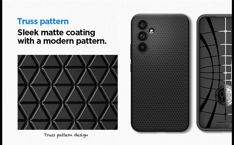 قاب اسپیگن Spigen Liquid Air Case Samsung Galaxy A54 5G دارای پوشش مات سیاه با الگوی هندسی است که به آن ظاهری مدرن و مقاوم در برابر اثر انگشت می‌بخشد. لبه‌های بالایی این قاب به طور استراتژیک بر روی صفحه نمایش و دوربین قرار می‌گیرند تا در صورت قرار گرفتن گوشی بر روی سطوح صاف، آنها را حفظ کنند.