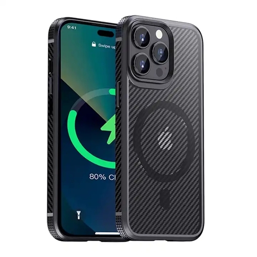 قاب آیفون 14 Pro iPaky MGC از ترکیبی از PC و TPU ساخته شده است و قسمت پشتی آن به صورت نیمه شفاف بوده و دارای بافت فیبر کربنی است. برای محافظت از صفحه نمایش و دوربین لبه ‌های قاب و دور اطراف دوربین به پوششی از جنس TPU مجهز شده اند.