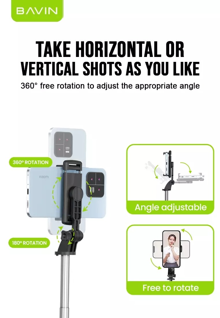پایه سلفی گوشی Bavin AP-10 دارای قابلیت چرخش 360 درجه گوشی به منظور عکسبرداری و فیلمبرداری به صورت افقی یا عمودی است. علاوه بر این شما میتوانید زاویه گوشی را نیز از بخش گیرهای تا 180 درجه تغییر دهید تا بتوانید بسته به نیاز خود در زوایای مختلف فیلمبرداری کنید. میتوانید در گالری تصاویر با ساختار بدنه این پایه سلفی بیشتر آشنا شوید.
