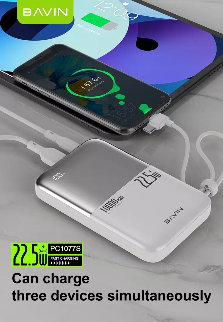 پاوربانک 10000 باوین Bavin PC1077S Fast Charge توان 22.5 وات به همراه کابل متصل تایپ سی و لایتنینگ