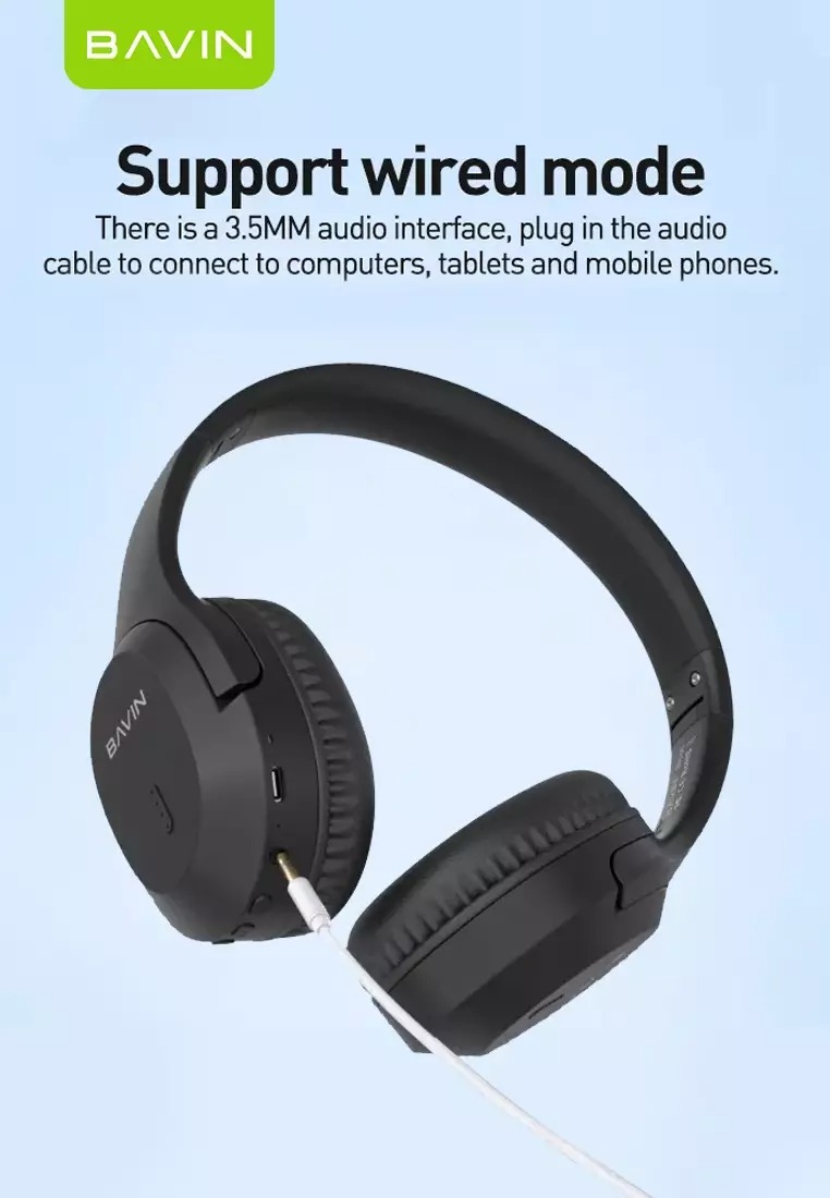 علاوه بر این شما میتوانید به کمک درگاه جک 3.5 قرار گرفته روی هدفون بلوتوثی Bavin BH-50، هدفون خود را به صورت باسیم نیز به انواع دستگاههای متصل کرده و از آن استفاده کنید.