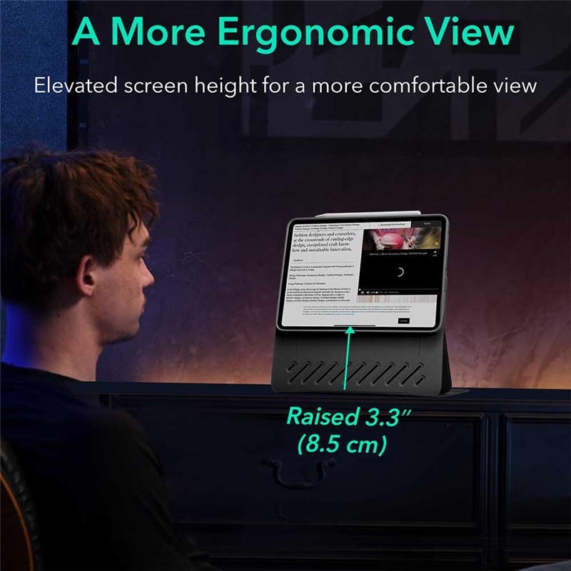 با استفاده از این کاور، آیپد ایر خود را در ارتفاعی نزدیکتر به خط دید طبیعی خود قرار دهید و در طول مدت زمان طولانی استفاده، در موقعیتی راحتتر و نشسته باشید. این ویژگی بهویژه برای کاربرانی که ساعات زیادی را به استفاده از آیپد میگذرانند، بسیار مفید است.
