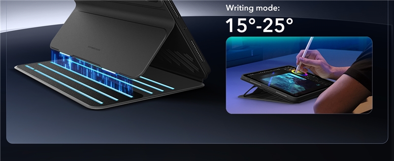این کاور با استفاده از دو پایه پشتیبانی و ۶ شیار مغناطیسی، امکان تنظیم آیپد در ۹ زاویه مختلف را فراهم میکند. از این ۹ زاویه، ۶ زاویه برای تماشا و ۳ زاویه برای نوشتن در نظر گرفته شدهاند. همچنین میتوانید این کاور را بهسرعت جدا کرده و برای بازیهای دستی یا اتصال مغناطیسی به یخچال استفاده کنید.