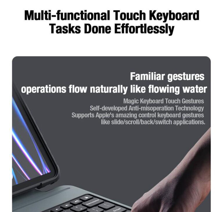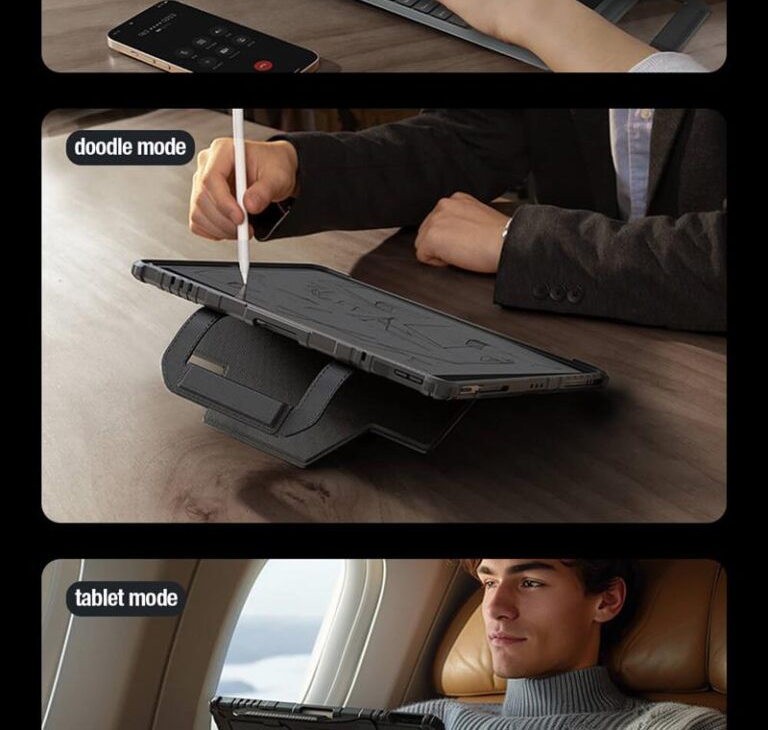 کیف کلاسوری نیلکین مدلBumper Go Keyboard یک کیف محافظ و مقاوم است که دارای یک کیبورد با کیفیت نیز میباشد که با استفاده از آن می توانید به کارهای روزمره بپردازید. تفاوت این مدل با Bumper معمولی دسته ی محکم بالای کیف است که حمل آن را آسان تر میکند. این کیف کلاسوری دور تا دور بدنه دستگاه را می‌پوشاند.این کیف دارای مقاومت بالای بوده و در برابر ضربه مقاوم است.البته به این معنی نبوده که در برابر ضربات شدید نیز مقاوم است.جنس این کاور ازTPUوPCساخته شده که دارای مقاومت بالایی می باشد.این کیف کلاسوری دارای محافظ دوربین بوده که به صورت کشویی عمل میکند.یکی از قابلیت های مفید در قاب تبلت ها داشتن استند است؛چون این دستگاه ها ابعاد بزرگی دارند و نگهداری از آن‌ها روی استند بسیار راحت تر و کم خطر تر است.از همین رو کیف کلاسوری دارای یک استند تاشو است که استحکام کافی برای نگهداشتن و استفاده از تبلت را خواهد داشت.شما می توانید حالت های مختلفی برای قرار گرفتن تبلت انتخاب کنید.این محصول نیلکین دارای یک کیبورد یا صفحه کلید قابل جدا شدن می باشد.شما در صورت نیاز می توانید از این کیبورد استفاده کرده و یا آن را جدا کنید.کلیدهای این کیبورد به گونه‌ای(قطره‌ای)طراحی شده که قالب انگشتان شما باشد.این کلیدها بسیار بی صدا بوده و وزن پایینی دارد؛بعلاوه کار با آن شما را خسته نمی‌کند.کلیدهای کیبورد کیف کلاسوری بسیار حساس بوده و با کمترین فشار عمل خواهد کرد.بر روی این کیبورد یک پد لمسی وجود دارد که می توانید از آن به جای موس استفاده کنید.شما می توانید از طریق بلوتوث این کیبورد را به دستگاه خود متصل کنید.نرخ نمونه برداری لمسی پد لمسی آن120هرتز بوده که بسیار حساس بوده و از چند لمس همزمان پشتیبانی می کند.این کیبورد دارای یک باتری150میلی آمپر ساعتی بوده که برای پر شدن آن نیاز به حدود1.5تا2ساعت شارژ بوده و با پر بودن شارژ تا30روز می توانید از آن استفاده کنید؛البته این عدد برای روزی2ساعت کار با کیبورد است که متناسب با استفاده شما متغییر خواهد شد.قابل ذکر است نسخه بلوتوث این کیبورد3.0می باشد و محدوده عملکرد آن حدود10متر است.در قسمت جلویی این قاب، جای برای قرار گرفتن قلم هوشمند اپل تعبیه شده که می توانید قلم خود را در این قسمت ها قرار دهید.