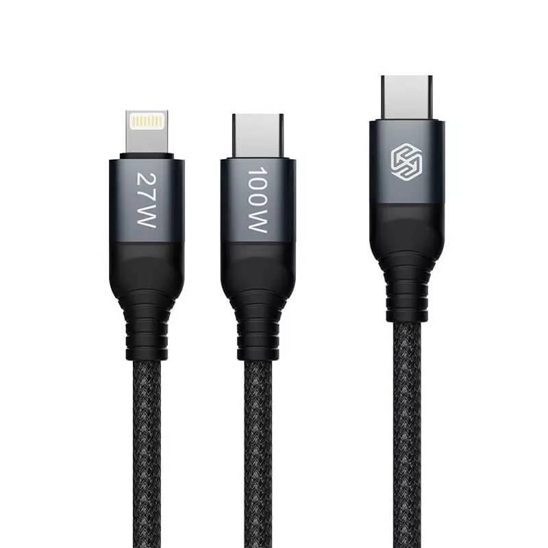 کابل USB-C به USB-C/Lightning نیلکین مدل DualPower 2-in-1 طول 1 متر از متریالی استفاده کرده که بسیار در مقاومت آن در برابر آسیب تاثیرگذار هستند. برای بدنه سیم شارژر از نایلون با بافتی زیبا بهره برده تا ضدگره و ضد پارگی و کشش آن را اثبات کند. آلیاژ آلمینیوم هم که ضد اکسیداسیون بوده و مقاومت خوبی را در برابر ضربه و آسیب ایفا می‌کند. با کمی دقت متوجه محافظی از جنس SR در بخش اتصال کابل به کانکتور خواهید شد که این قسمت را در برابر پارگی در اثر خمیدگی‌های مکرر استقامت بخشیده است.روی بدنه کابل، بخشی که کابل را به دو بخش تقسیم کرده چراغی نشانگر مشاهده می‌کنید که شما را از جریان شارژ مطلع می‎کند.وجود دو کانکتور در طراحی این کابل شارژ سریع 2 در 1 نیلکین امکان استفاده از آن برای شارژ همزمان دو دستگاه را فراهم کرده است و با برخورداری از دو کانکتورUSB-C/Lightning قابل استفاده برای انواع دستگاه‌های دارای این درگاه است. کانکتورها از تکنولوژی شارژ سریع PD پشتیبانی می‌کنند و مجموع شدت جریان آن‌ها به 127W می‌رسد. شدت جریان کانکتورها به تنهایی برابر با 100و 27 وات بوده و شارژی سریع را در اختیارتان قرار می‌دهد .با انواع لپ‌تاپ، ایرپاد، کنسول‌های بازی و برندهای مختلف موبایل از جمله سامسونگ؛ شیائومی؛ هوآوی؛ هونور و … سازگار است.
